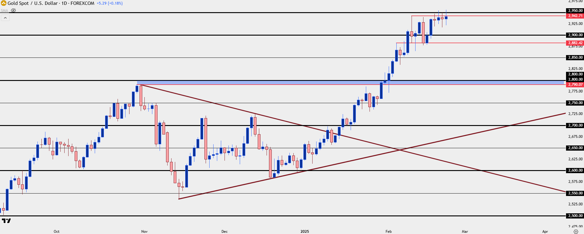 At this point resistance has continued to show at the 2950 level in gold and this is after bulls shied away from a test there two weeks ago. But, at this point, buyers haven’t relented as this morning brought a third consecutive test of that price on the daily chart, and this time buyers were able to budge up to a fresh ATH, even if slightly. And as I noted earlier, there’s not much that I can consider bearish here from a technical perspective as buyers have just continued to push and they haven’t yet let go of the reins.