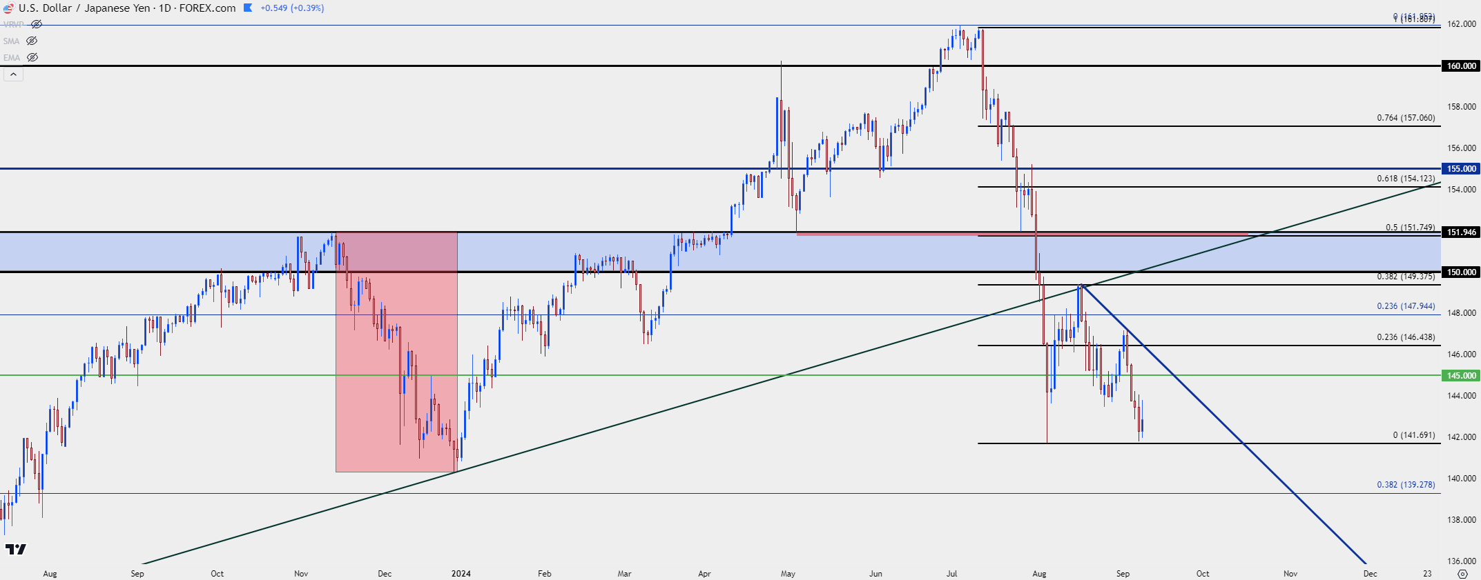 The current 2024 low plots at 140.30 and below that, the 140 handle looms large. For longer-term bulls this could be an area of interest for possible stops. Stops on long positions are ‘sell to close’ logic often oriented to execute ‘at best.’ This can hasten declines as more supply comes on the market after the big figure was traded through, similar to what happened on the upside of price back in April, when USD/JPY shot through the 151.95 level that had previously been defended by the Bank of Japan.