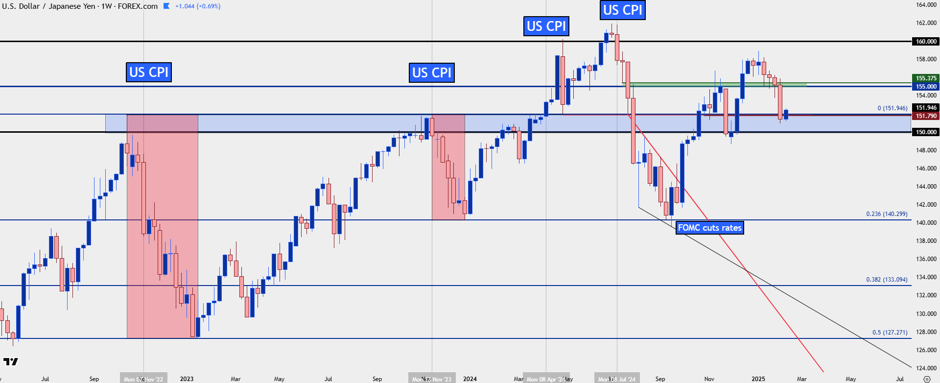 Reversals in November of 2022 and 2023 both took hold after below-expected CPI data, as did the sell-off last July. And the breakout last year, when the pair finally traded through the 151.95 level that the Bank of Japan had previously defended, that also happened around a U.S. CPI print, albeit a stronger data outlay.