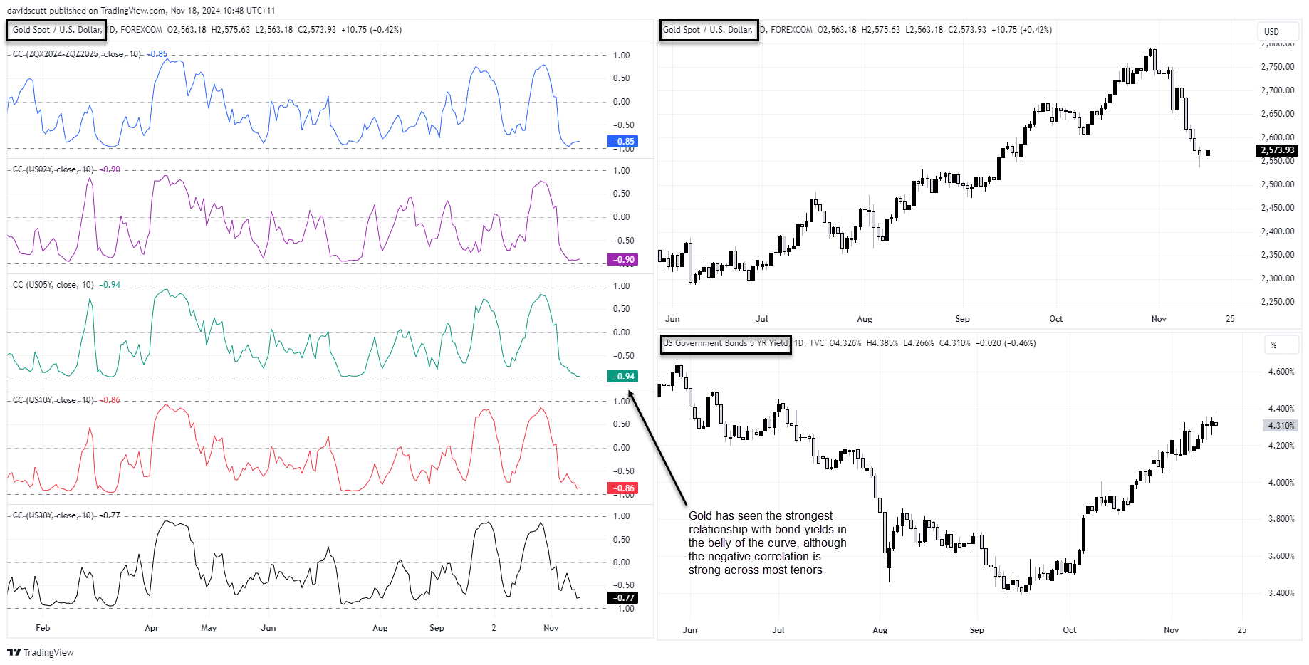 The relationship between gold and five-year Treasury yields has been especially strong at -0.94 over the past fortnight, and only slightly weaker with 10-year yields over the same period.