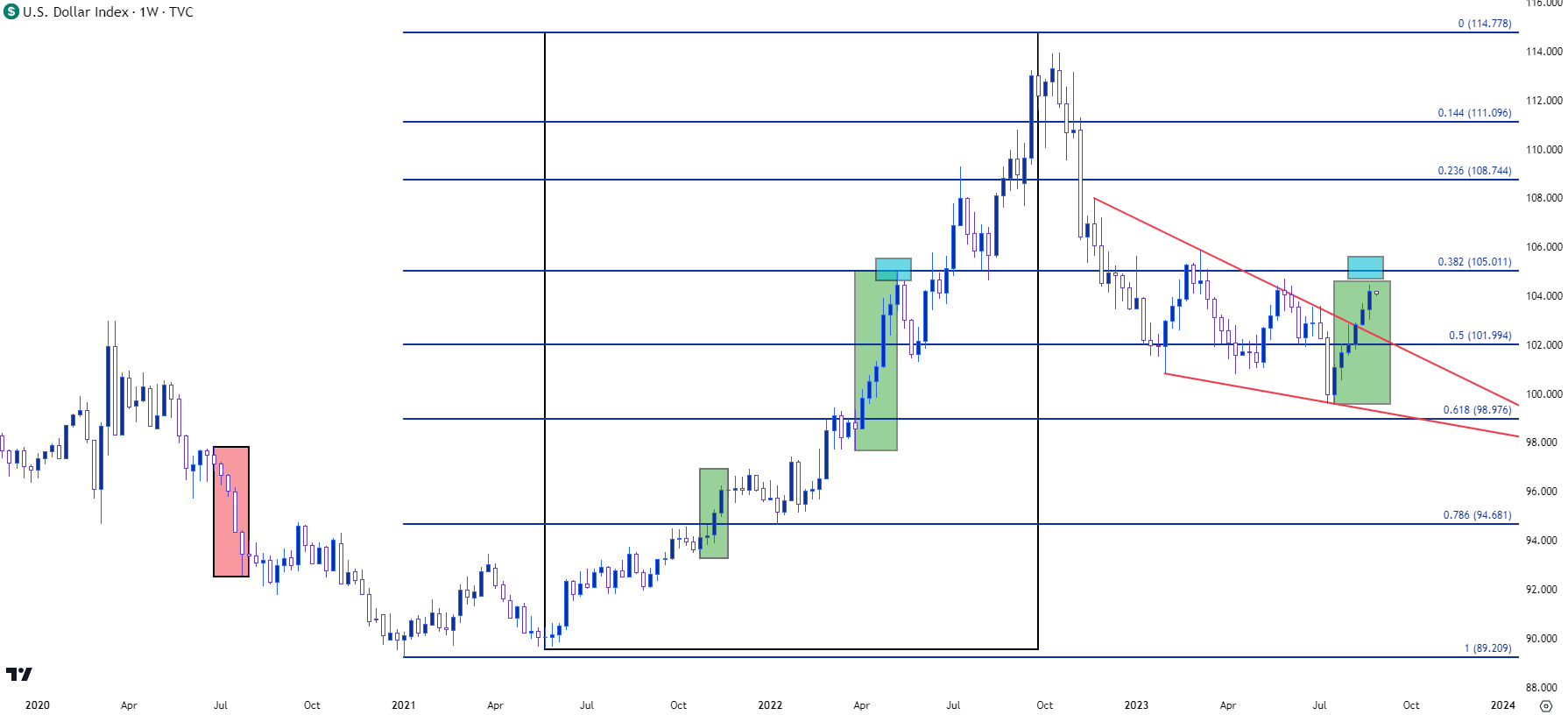 As an interesting point – the prior six-week streak that finished in May of 2022 topped out at the 105.00 handle, which has since become the 38.2% Fibonacci retracement of that bullish trend. This would offer a bit of confluence for that next significant spot of resistance for the US Dollar.