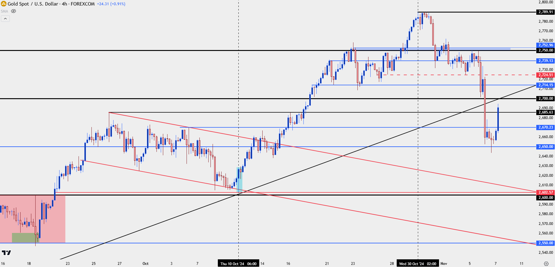 - The election night brought a strong sell-off in gold and at this point the question remains as to whether that’s the start of a reversal or whether it was a simple pullback in a broader bullish trend. So far, there’s been a strong reaction to 2650 support but it’s how the metal performs at tests of possible resistance that can provide early clues to bigger-picture direction.