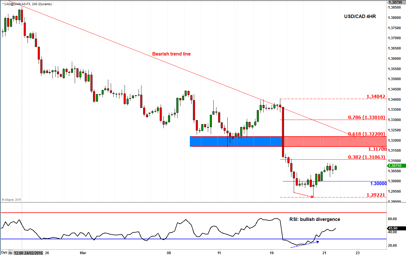 Zooming in to the slightly lower 4-hour time frame, in figure 2, and we can see why the USD/CAD has rebounded: the RSI was at the severally "oversold" territory below 30 and there was a short-term failure to hold below the prior low at the end of last week. Ahead of the weekend, the sellers probably took profit on their shorts around the psychologically-important 1.30 handle, leading to a modest bounce which has continued in this data-void session. But key resistance is looming around 1.3170, a level which was previously support. In fact it is a resistance zone that needs to be watched rather than just a level. The 1.3170 level is the lower end of this resistance range, while the upper end is where the bearish trend line meets with the 61.8% Fibonacci retracement level, around 1.3220.