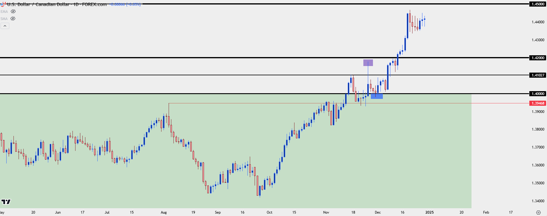 But it was what happened on Tuesday, November 26th that really started to drive the matter, and that was when President-elect Trump first opined on the prospect of 25% tariffs on Canadian goods unless they clamped down on the northern border. That drove a spike in the pair’s price (highlighted by purple box on the below chart), which soon reversed – but after that reversal there started to show support at the 1.4000 handle and buyers continued to show-up. Bulls went to work again after the NFP report in early-December, and USD/CAD price action continued to spiral-higher through the FOMC rate decision a couple of weeks later.