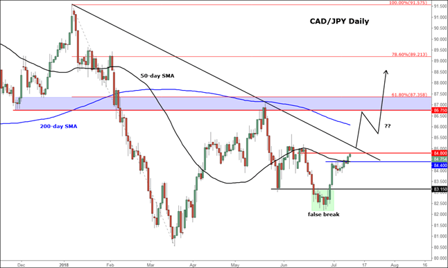 From a technical perspective, the CAD/JPY has formed a false break reversal when it wouldn’t hold below the prior short-term swing low at 83.15 at the end of June. Its refusal to go lower was rewarded with a quick rally back above this level as the shorts probably abandoned their positions. That rebound may have created a higher low – but we can’t confirm as price is yet to make a distinct higher high.