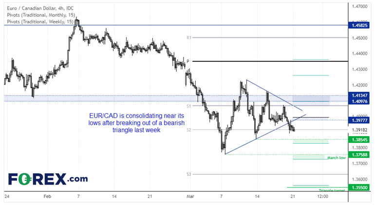A strong retail print on boosted the Canadian dollar on Friday and helped EUR/CAD break to the downside of its symmetrical triangle. The pattern projects a target around 1.355, although support zones near the March low and 1.3855 low make suitable interim targets, depending on time horizon of the trader. Prices need to remain below the broken trendline to keep the triangle intact, and ideally any pullback against the breakout will remain below the 1.400 area, near the weekly pivot point.