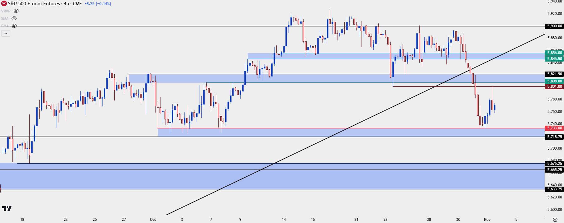 A bit-lower is another zone of interest if we do see the pullback spread, and that’s taken from the contract gap that showed in September, just ahead of the FOMC rate cut. I wrote about that at the time and so far, it hasn’t been tested. But the contract gap from June had showed support on a couple of different occasions before buyers ultimately took control and that’s a scenario that remains in-play in the next couple of weeks ahead. That zone plots from 5633-5675.