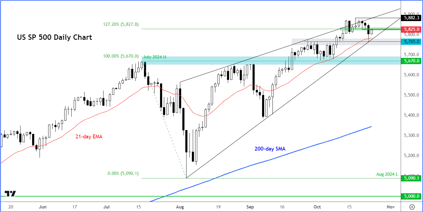 However, there are signs that a breakdown could be imminent, especially with the election drawing closer. If the S&P 500 breaks below the 5760-65 support zone, the next support level to watch would be around 5670. This area served as resistance earlier in the year, and a drop below this could open the door to further declines. On the upside, 5825/30 is a critical resistance level that the bulls need to break to sustain the current rally. If this level is breached, the index could be on track to even push for a new record. But following Wednesday’s selling, the risks are skewed to the downside from a technical point of view.