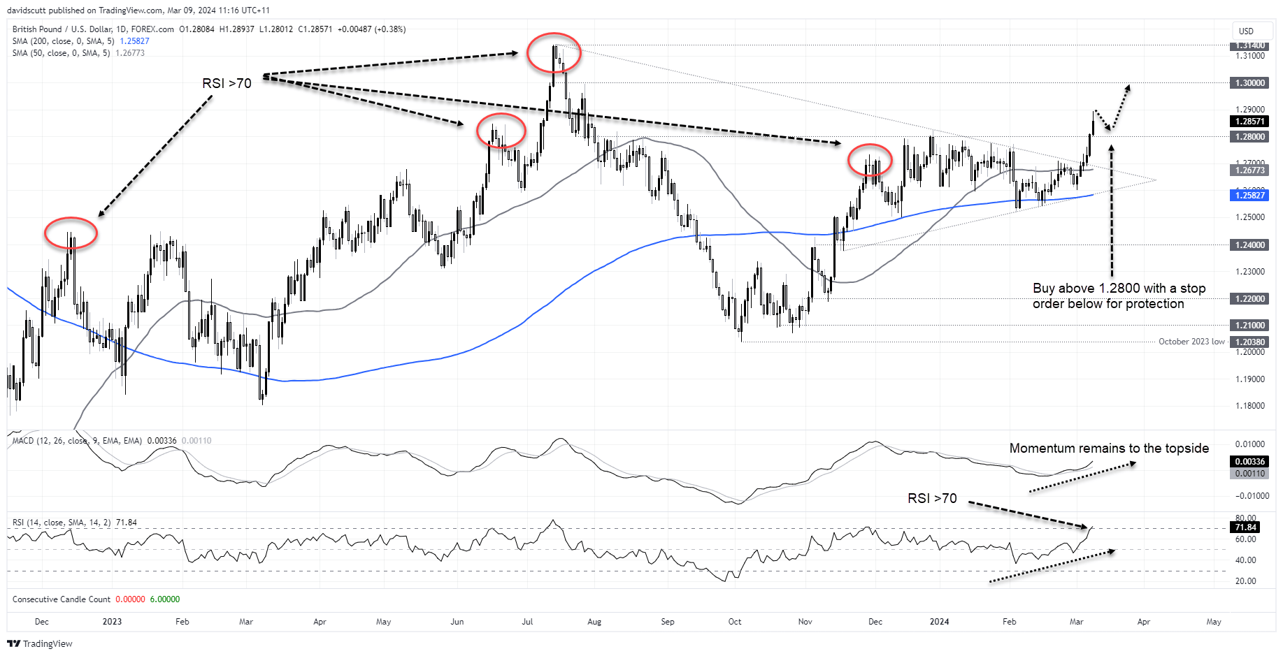 While a bullish move with momentum continuing to build to the upside, it has seen GBP/USD move into overbought territory on daily RSI, providing a warning that a near-term pullback/consolidation may be on the cards. I’ve circled on the chart other periods recently where GBP/USD has been overbought to highlight it has often coincided with short-term tops.