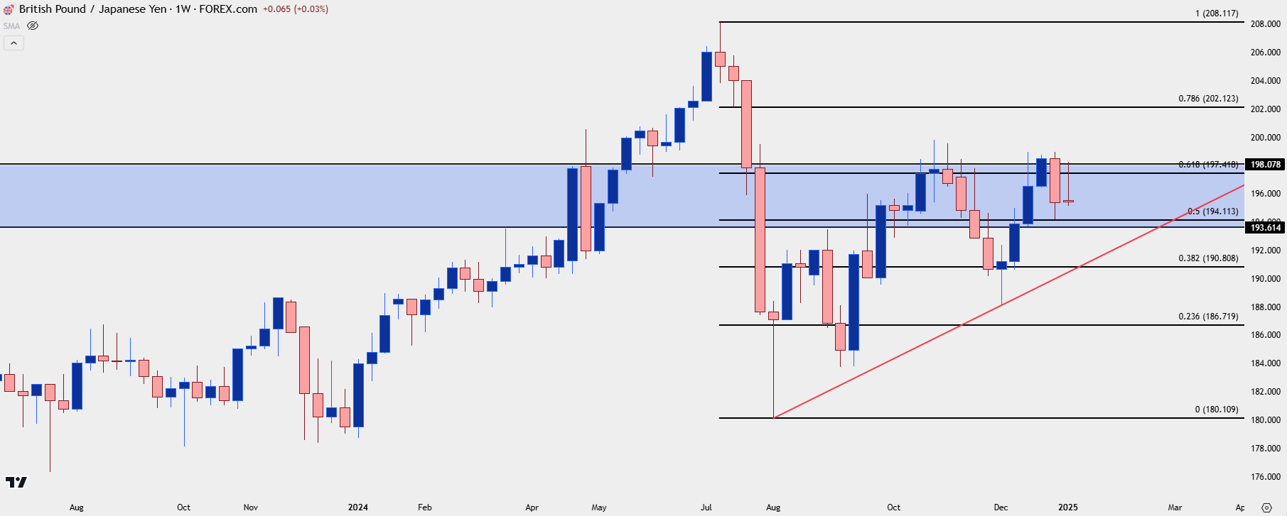 Initially, 193.61 helped to hold resistance in March of last year and then 198.08 was in-play as resistance a month later, before becoming support in June. But when JPY reversed aggressively in July, price action pushed back-below the big zone and for the past four months, the top-end of that area has helped to hold the highs.