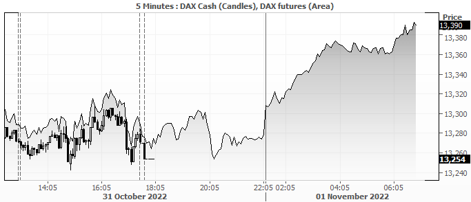 - Germany's DAX futures are currently up 98 points (0.74%), the cash market is currently estimated to open at 13,351.74