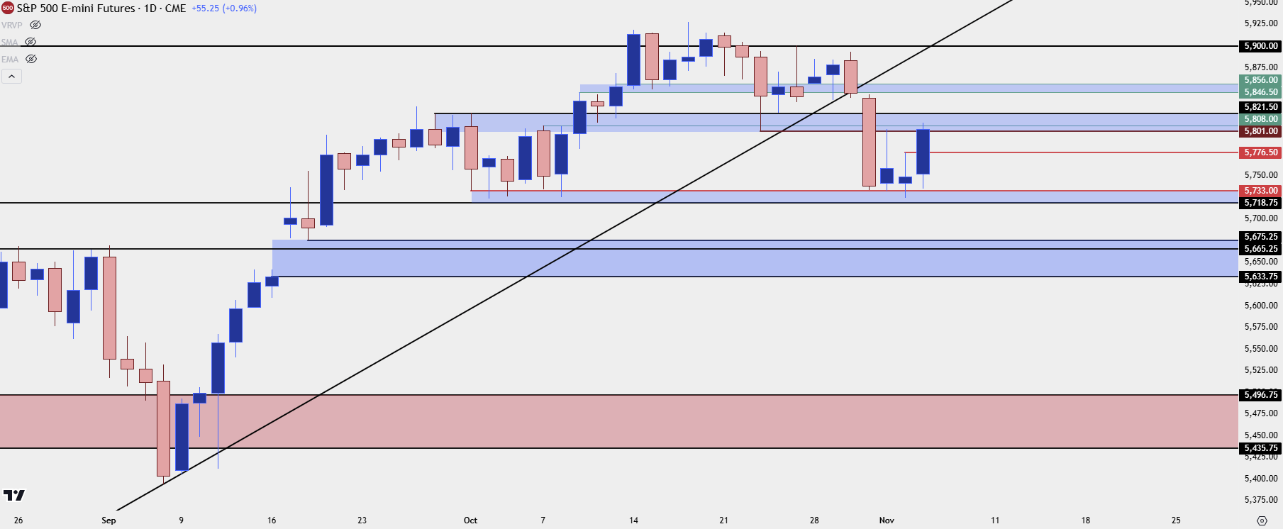 In S&P 500 futures, support is in-play and this is the same zone I looked at previously, from around 5718.75-5733. That latter price traded for each of the past four days and bears haven’t been able to break much ground below. Price has already jumped up to test resistance at prior support, around the 5808 level. So this could be a sub-optimal time to look at long exposure but, instead, there’s now higher-low support potential at prior short-term resistance, around 5776.50.
