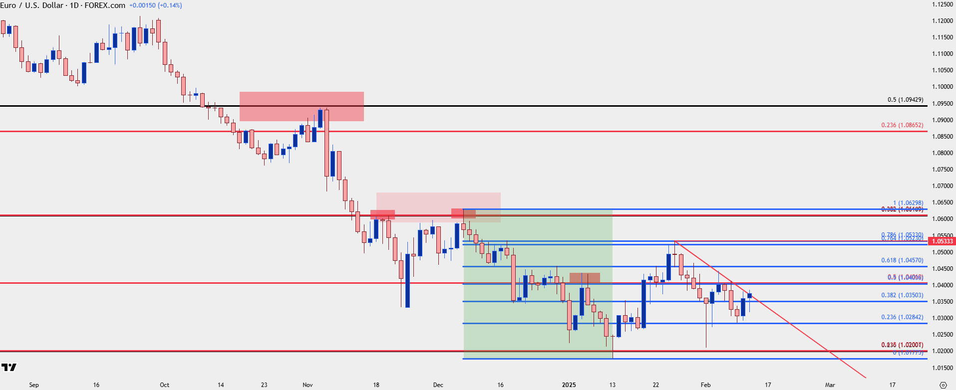 EUR/USD was slammed after the open last week as Trump had opined on European tariffs the weekend before. He said that tariffs would be coming ‘pretty soon,’ and while opaque on timing, it highlighted the fact that a tape-bomb could arrive at any moment that could put the single currency under threat. EUR/USD has since recovered from that sell-off but rallies have been short-lived. Last week saw resistance hold at a confluent spot of Fibonacci levels around 1.0400 and the pair sold off into the end of last week and through this week’s open.