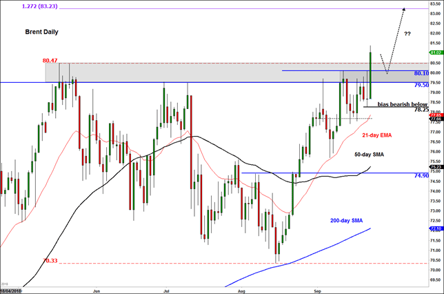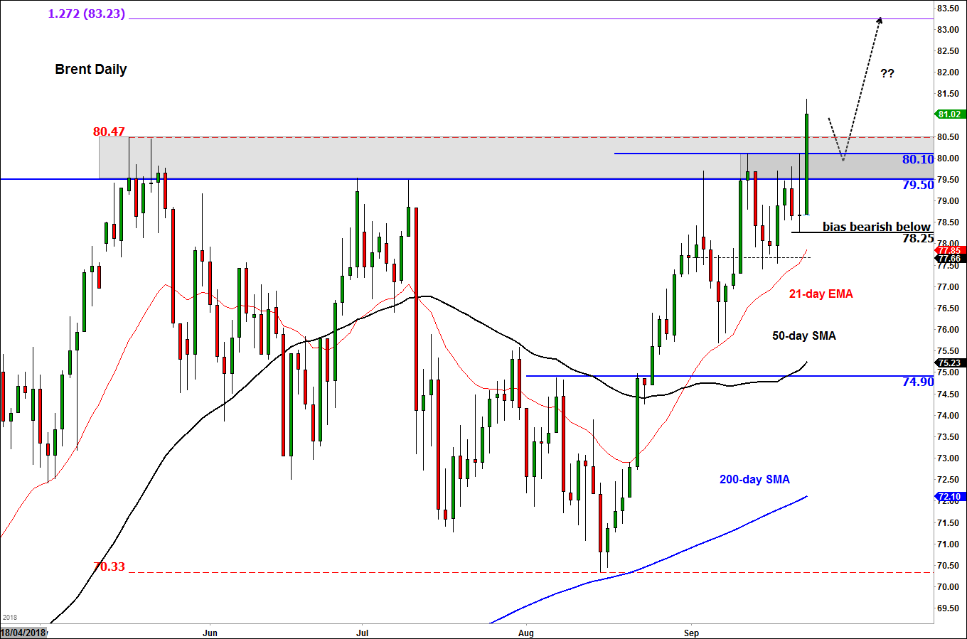 We would only turn bearish on oil in the event prices go back to within their existing range with a clear signal that the bulls are trapped. Thus, a break below $78.25 – the last low pre breakout – would be the confirmation we would look for a bearish reversal. Alternatively, Brent oil may create a distinct reversal pattern at higher levels first.