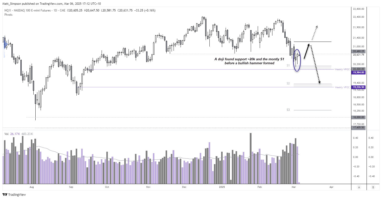 It could argued that price action on Nasdaq futures are marginally more bullish than those seen on the S&p 500. While both formed a bullish hammer on Wednesday, the Nasdaq printed a doji instead of a decisively bearish bar with a daily close beneath key resistance. The doji also found support at the monthly S1 pivot, just above a weekly VPOC (volume point of control) and 20k handle.
