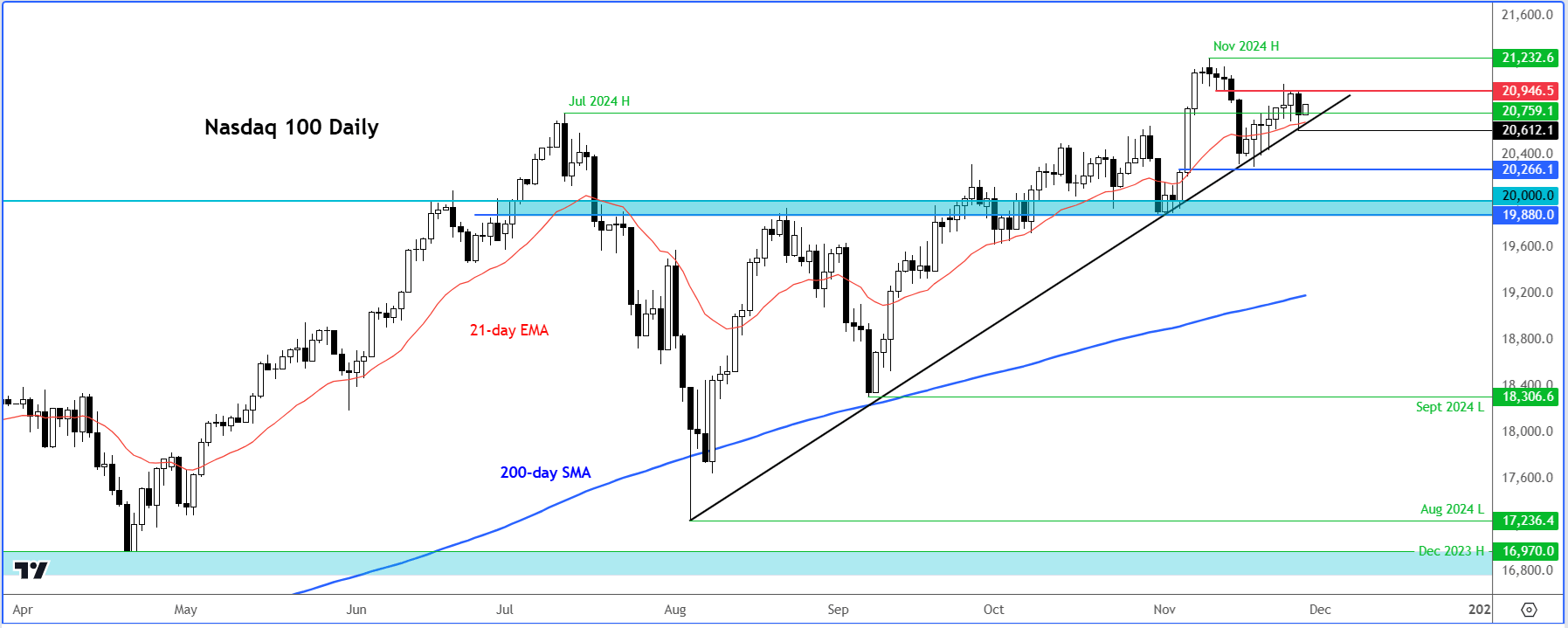The technical picture for the Nasdaq remains bullish, even though momentum has slowed. Our US Tech 100 chart shows higher highs and higher lows, keeping the trend intact. A key support level lies at 20,600, where the 21-day exponential moving average aligns with a bullish trend line intact since August. A daily close below this trend line could shift sentiment, with further support at 20,260/70 and a critical pivot at 19880-20,000 zone. A break below this latter level would signal a potential market top. Resistance at the July high of 20,760 remains a hurdle, even though we are currently trading above it. We need to see more evidence that the index can hold above it. Despite recapturing this level after the US presidential election, the market failed to hold it, triggering a sharp sell-off a couple of weeks ago. A decisive break above this high this time could pave the way toward the all-time high of 21232 and beyond.