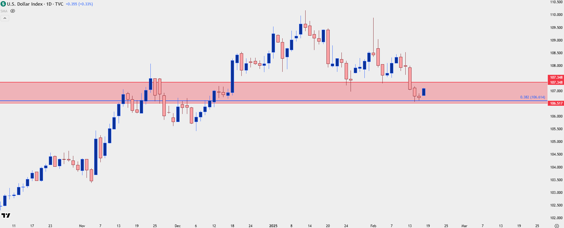 This current support is also of note from the two-year range that was broken in the post-election rally last year. The top-end of that zone at 107.35 has already had impact, helping to set support for three weeks until last week’s breakdown.