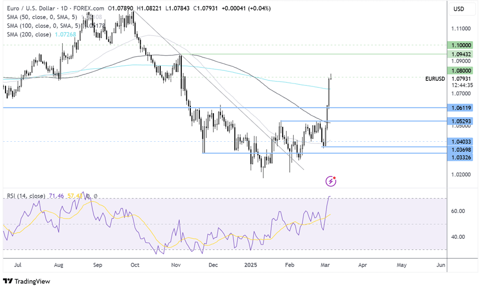 EUR/USD broke out above 1.05 after multiple attempts, rising above several resistance levels, including the 200 SMA, to 1.08. The RSI is overbought, so buyers should be cautious about chasing the price higher. A pullback could be on the cards.