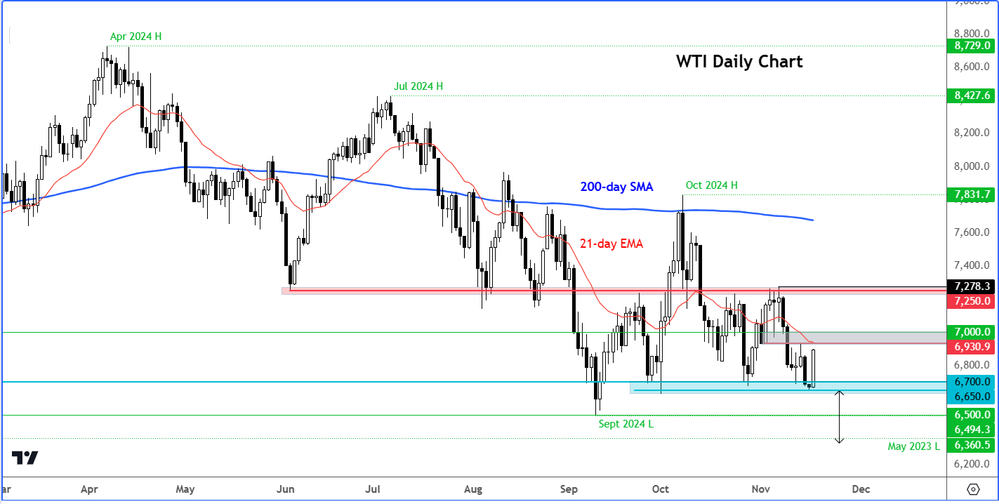 Oil prices rebounded strongly on Monday morning, but this could be a short-lived bounce as the crude oil outlook remains far from certain. The gains came on the back of raised geopolitical tensions as the US government said it is allowing Ukraine to use long-range American missiles against Russia. President Putin had previously warned that his country would view a strike inside Russia with missiles supplied by the US as a direct participation of NATO in the war. But questions remain as to how he will respond. And against a backdrop of rising supply and limited demand growth, not to mention oils’ ongoing bearish technical trend, the path of least resistance remains to the downside, and I would be surprised if a breakdown does not occur in the coming days. That’s unless Biden’s decision triggers some sort of Russian response that causes a supply side shock. Sentiment towards crude oil has turned bearish since Trump’s election victory, and amid growing signs of excess surplus coming from non-OPEC producers. There are now some concerns that if the OPEC+ cannot agree to extending their production agreement next month, this could give rise to fresh selling. At best, we could be looking at subdued prices in the coming months, until either demand growth picks up with the global economy, or oil production growth slows.